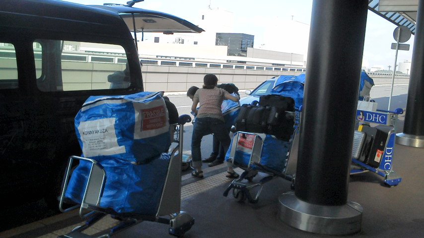 怪しいハイエースから怪しいビニールシートで作った袋の荷物がどんどこ降りてきます。