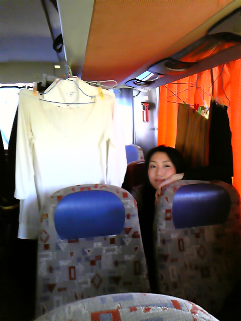 一番後ろの席に横になるために入り込んでいる大石さん。