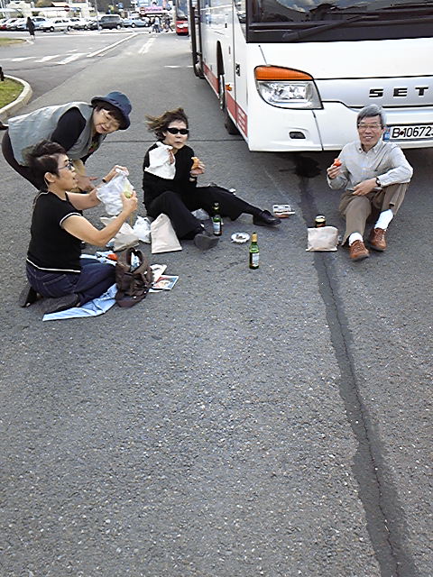 日差しが強かったのでバスの影に隠れて、ショッピングモールで仕入れた生ハムなどを召し上がるお客様たち!