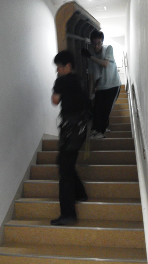 締めくくりの写真は、こんなに細い階段を一生懸命装置を運ぶイケメンスタッフさんの勇姿。