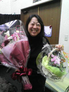 まちゃこさんを始めとする、稽古場見学に来てくださった、キラリかげき団の皆さん、ありがとうございました。すてきなお花までいただいて、感激です。今回は作曲が早く仕上がっていたので、稽古が見られる、と喜んでいたのですが、よくよく考えてみれば、8人編成のオーケストラのためのオーケストレーションという作業があったのでした。23日の稽古場見学の日には、必死の形相で書きまくっておりまして、お酒の一滴も飲めない悲しい誕生日でした(涙)。24日の深夜、350ページのオケ譜をやっと書き上げ、ほっとしております。手書きでやっております。(今や残り少なくなった手書きの作曲家なんす。)さて、これからは心おきなく稽古を見られるぞ!ところで、来年のキラリかげき団の公演に向けても、いろいろ計画中ですので、お・た・の・し・み・に!