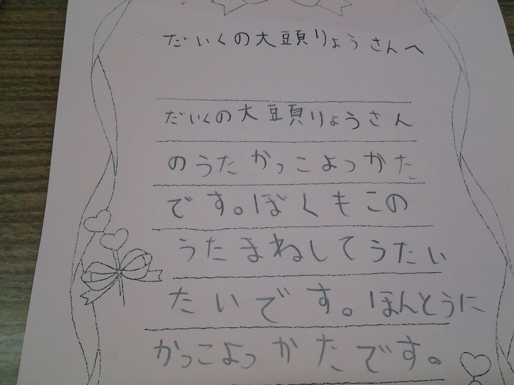 「だいくの大頭りょうさんへ、だいくの大頭りょうさんのうたかっこよかたです。ぼくもこのうたまねしてうたいたいです。ほんとうにかっこよかったです。」