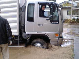 富山の小雨の中、ぬかるみに入り込んでいる我がトラック。