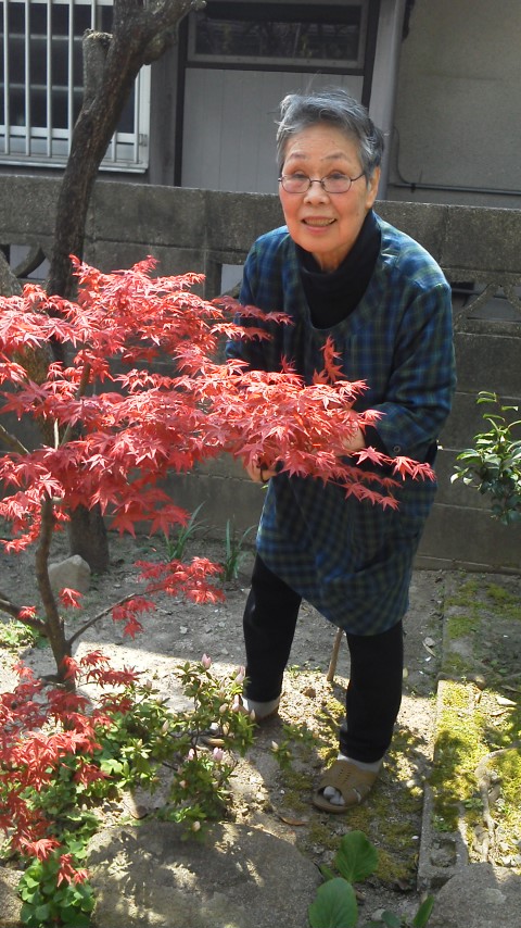 写真は春に紅葉するとぼけた実家のモミジと母親。