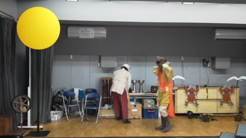 花小金井の体育館。ピアニストゆだやんと子供・・・と思いきや、この学校の先生であり、こんにゃく座おぺら塾の生徒であるモッチ登場。