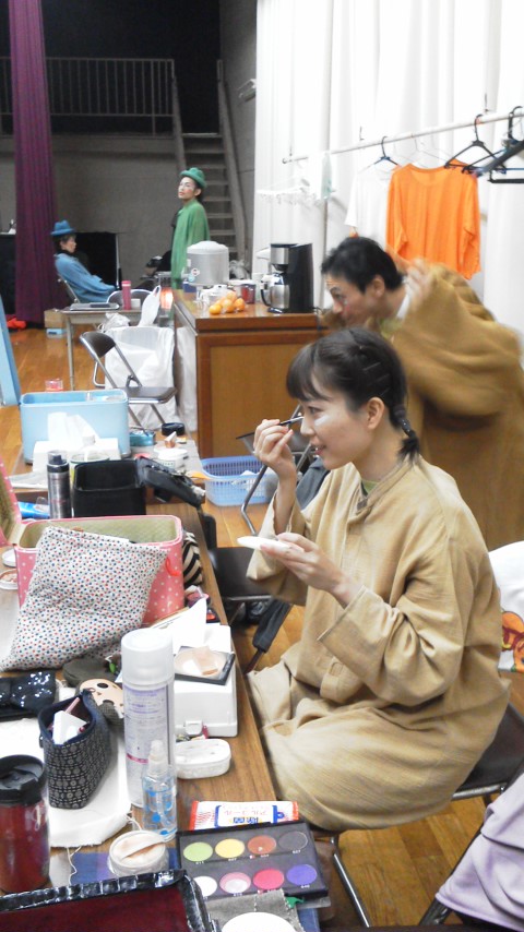 みんながさっさと準備を終えてストーブにあたっている所、まだまだメイクができない。