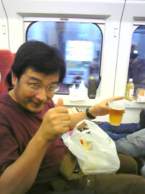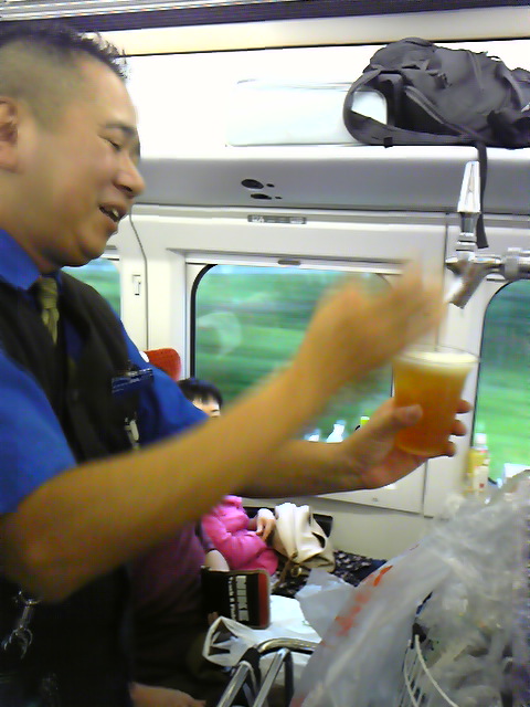 「新幹線で生ビールは珍しいんですよ。ぼくは生ビールのマイスターですから」