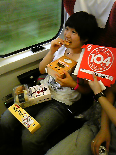 われらが人気者、マドカちゃんは牛肉弁当二種類、ピザ、お菓子をかかえて長旅に備える!