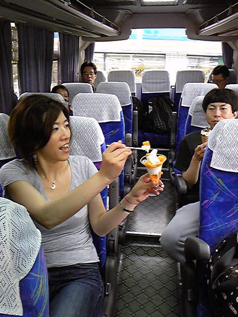 富岡町の本番を終えて貸し切りバスに乗って、次の相馬市民会館へ・・・。