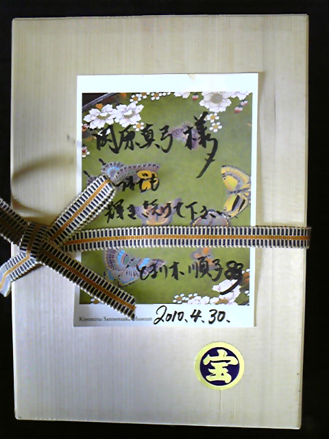 何かの木箱に素敵な絵はがきをはり、桜の箸袋の割り箸を添え、リボンでしめる。