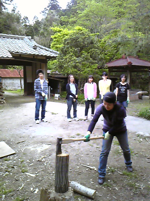 力強い女子(親子どん初参加、座員のチャミ)はまきを割っている。