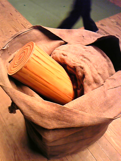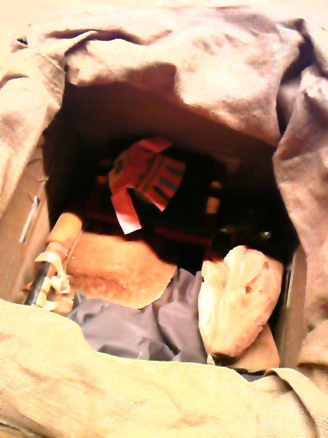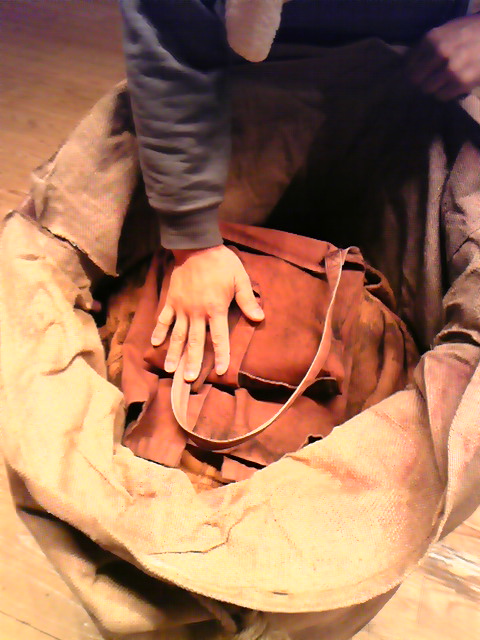 ドンゴロスの中にどんどん、たくさんの小道具を詰め込んでいく。