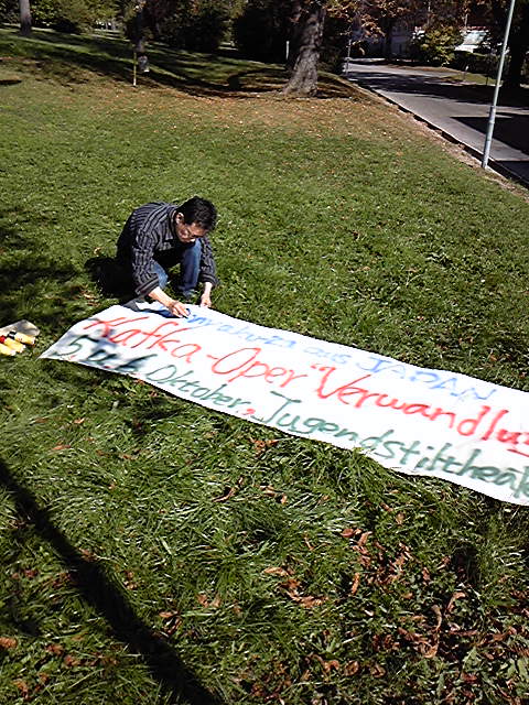ためではありませんが、街頭パレード用の横断幕をお天気の中でせっせと書く大石さん。