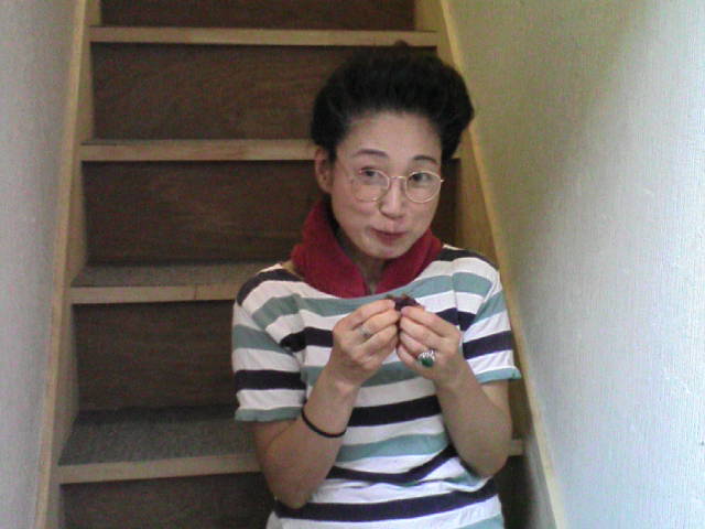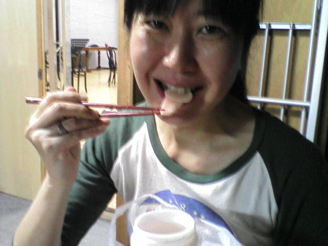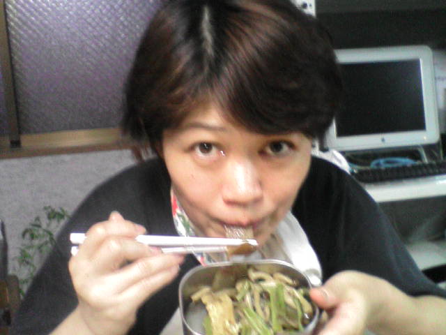 その前で、理恵と同じく毎日イチヂクを(私は調理して)食べ、萩家の生姜の漬け汁(かなり酸っぱい甘酢)を飲み、元さんのお弁当の残りを平らげ、最後に元さんの野菜ジュースを頂く岡原真弓。