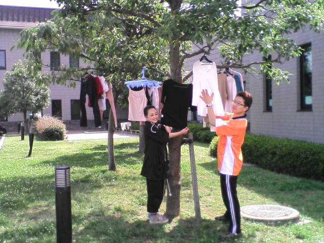 本番が終わり、次の仕込みをするまで、洗濯物を干す場所がなかったために、木に干してみた。(もちろん私の命令で)