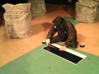 黙々とピアニストの為の譜面台を作っている、舞台監督。