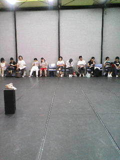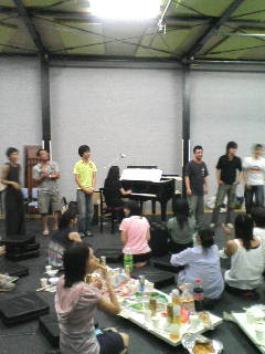 稽古場にて、打ち上げをしながら、さきほどの発表会を聞いて、興奮した座員が歌う歌う歌う。